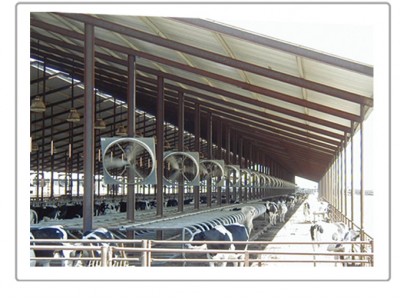 为了达到好的通风效果,风机的安装位置是牛棚料槽的正上方,风机下沿距离地面2.7米,倾斜角度在15到30度为佳。
